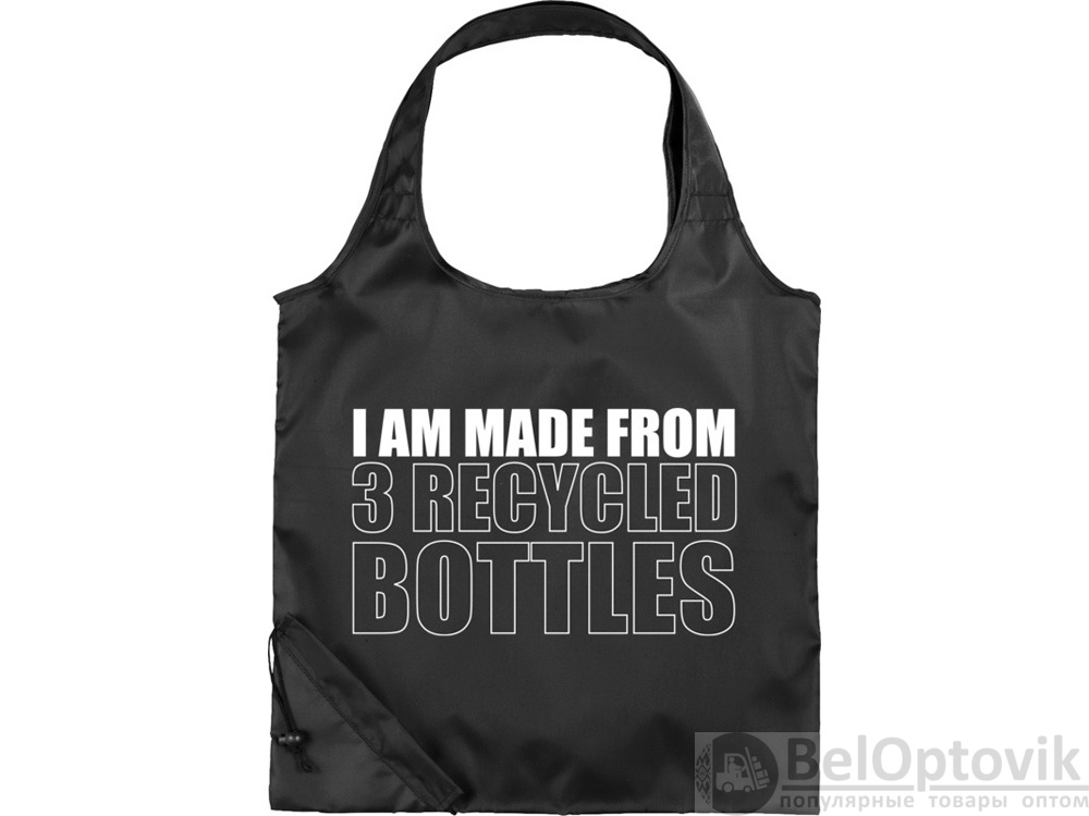 На одной из сторон сумки напечатан текст I am made from 3 recycled bottles.