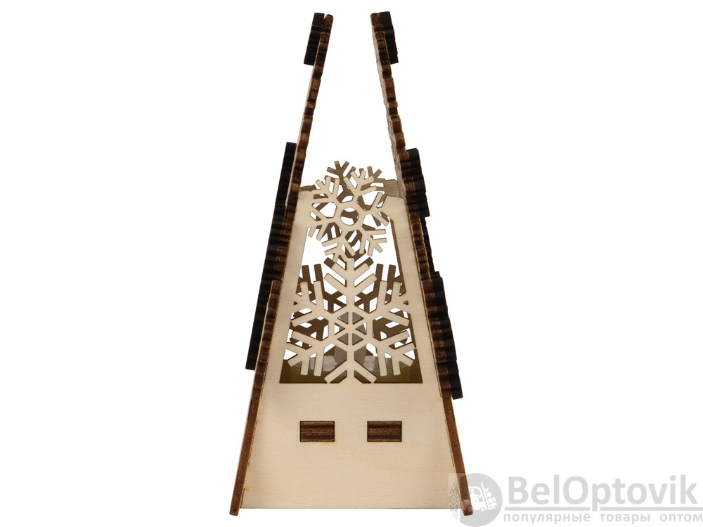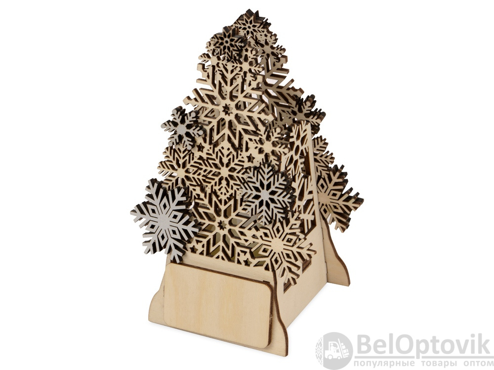 Фонарик с электрической свечой в виде резной елочки с декоративными снежинками серебристого цвета. Батарейка в комплекте. Для удобства нанесения Вашего логотипа, елочка поставляется в комплекте с деревянным шильдом, на котором можно сделать гравировку и другие виды дизайна.