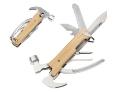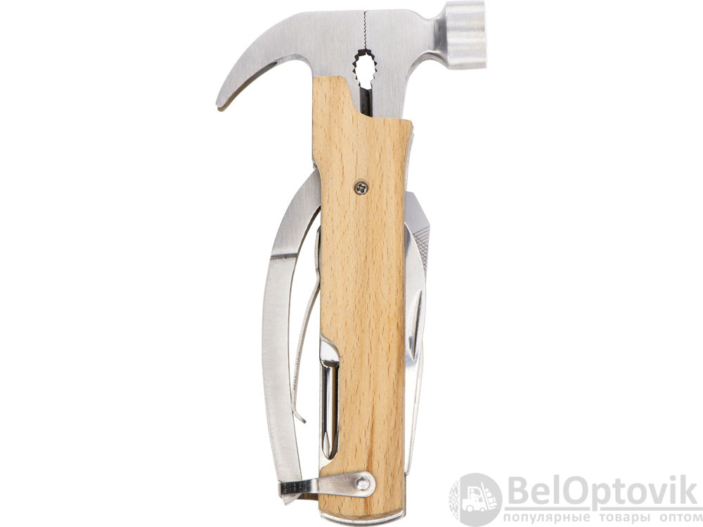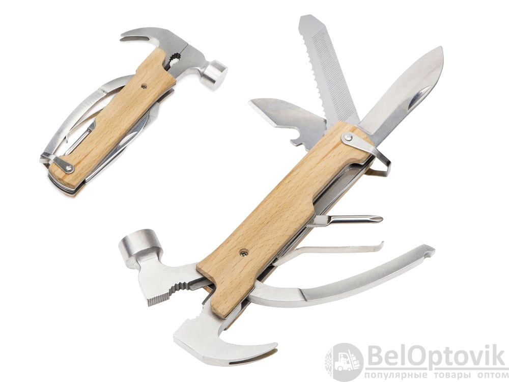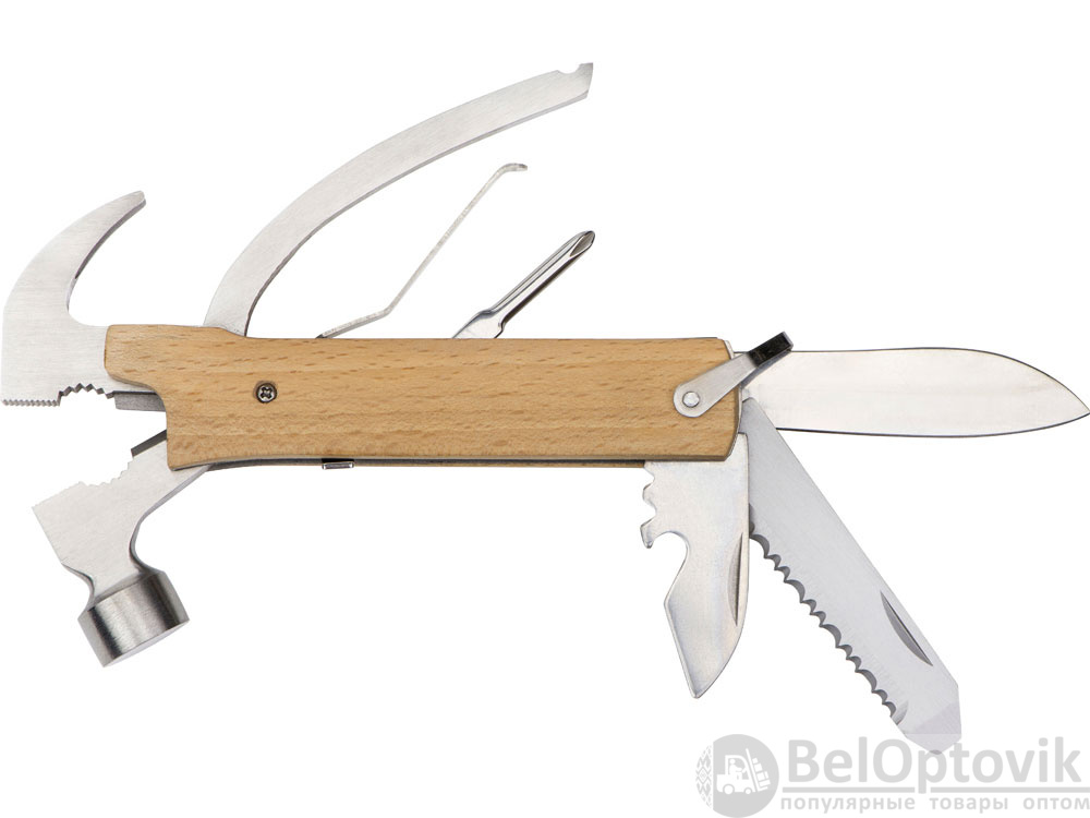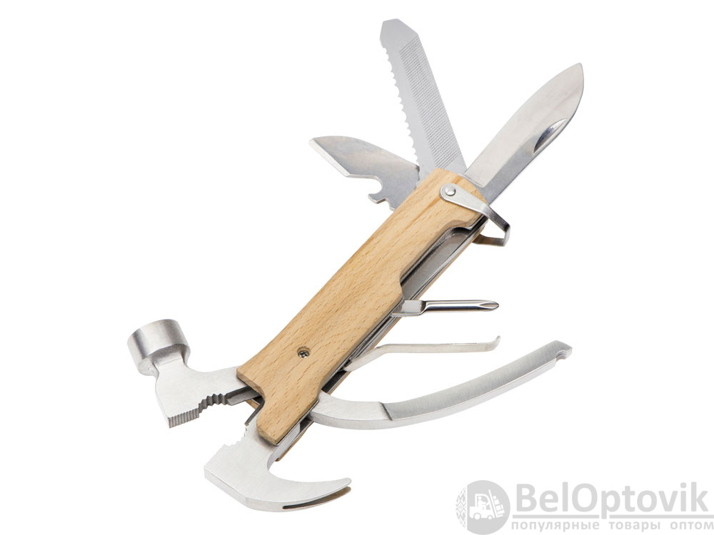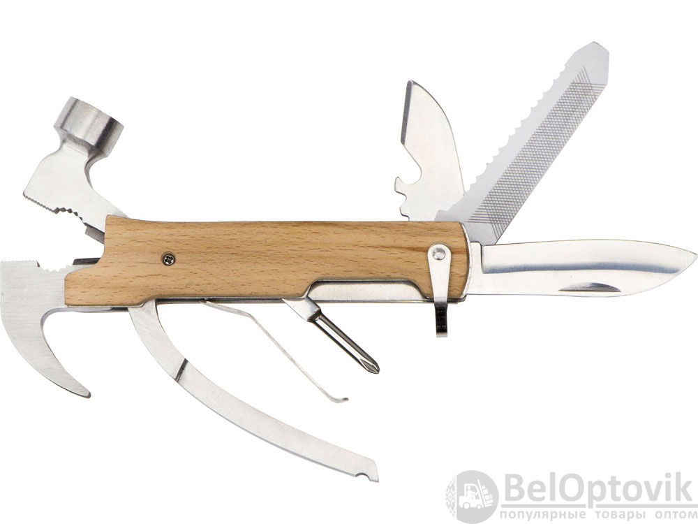 Многофункциональный инструмент, который выручит дома, на даче, в путешествии, походе и во множестве других ситуаций. Полностью сделан из металла и декорирован накладками из натурального дерева. Чехол в комплекте.