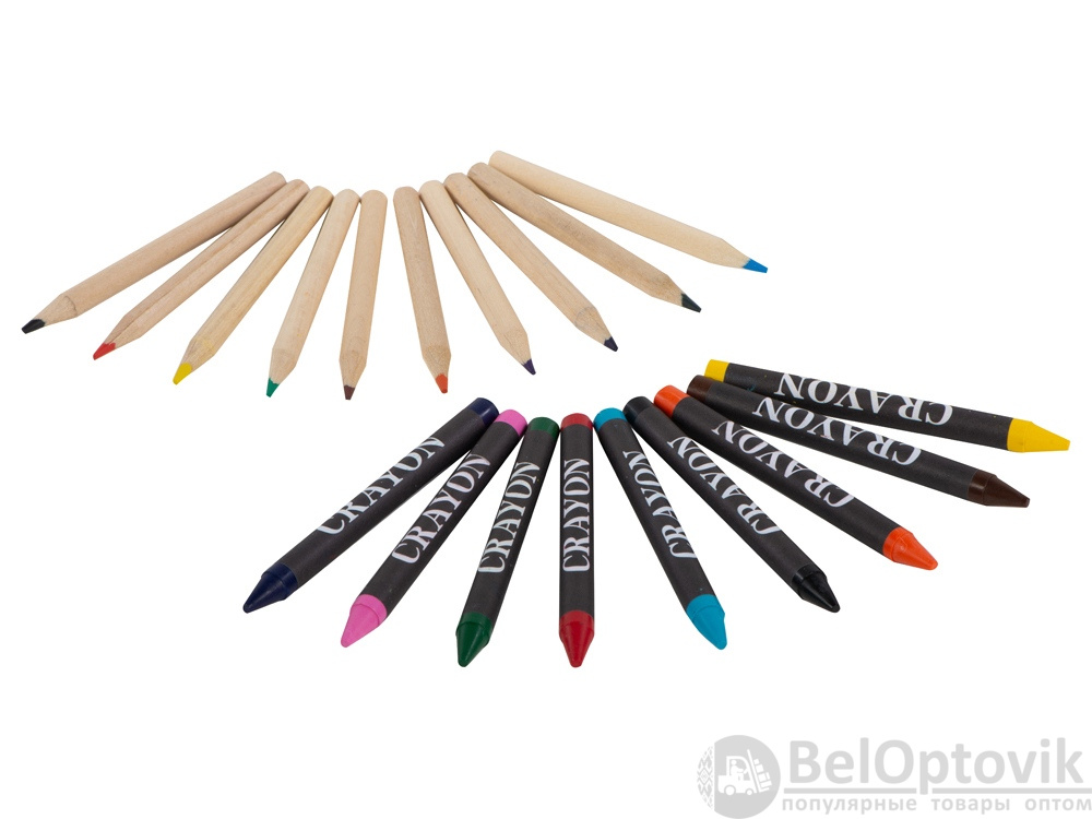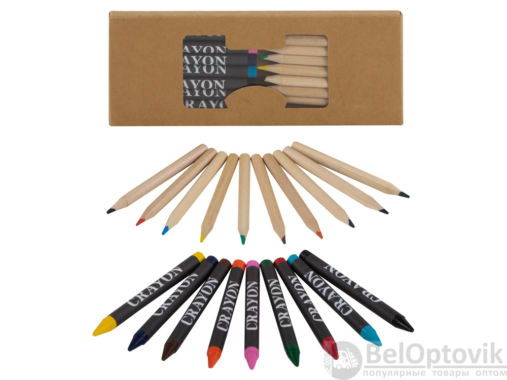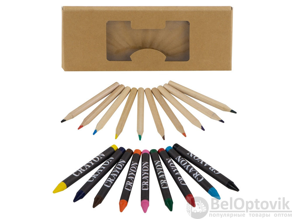 Набор из 19 карандашей. 9 цветных восковых карандашей и 10 цветных карандашей в картонной коробке с пластиковым окошком.