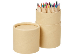 Набор из 24 цветных карандашей, ластика и точилки в круглом картонном футляре, который удобно использовать как карандашницу.