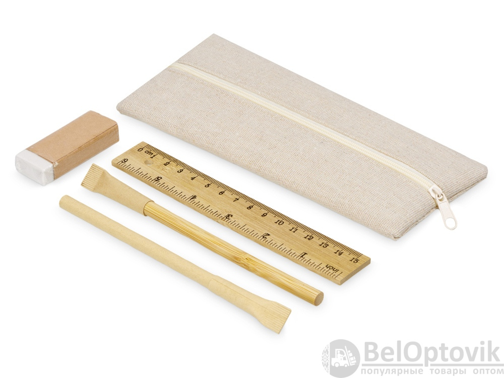 Удобный набор канцелярии со всем необходимым. В наборе: пенал на молнии, ручка Recycled, вечный карандаш в бамбуковом корпусе с колпачком из переработанной бумаги, ластик и бамбуковая линейка. Чтобы все самые необходимые пишущие принадлежности были под рукой.
