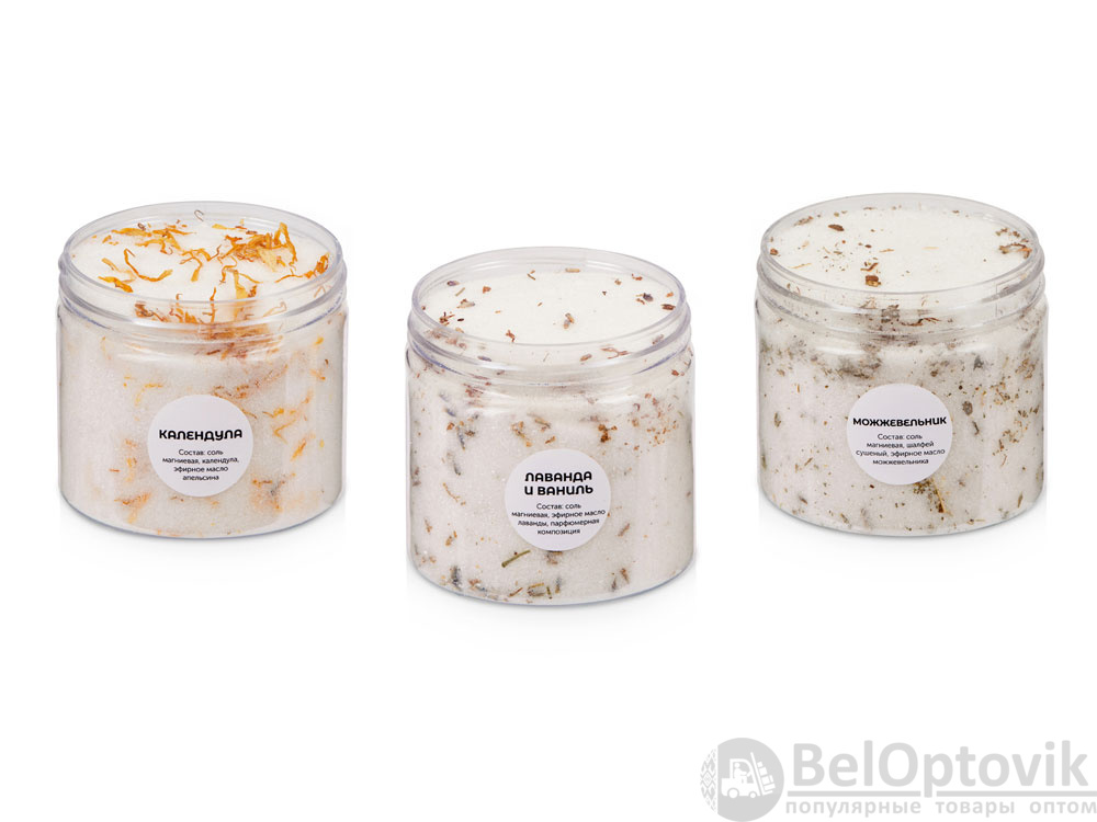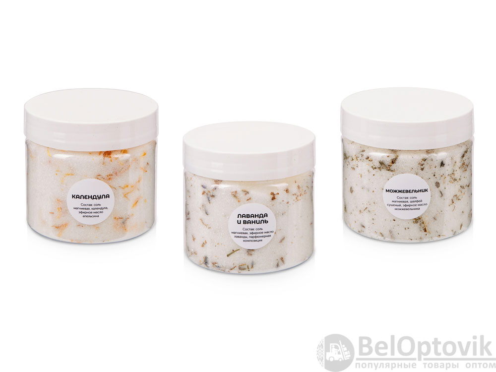 - Комплектность: соль для ванны календула в банке, соль для ванны лаванда-ваниль в банке, соль для ванны можжевельник в банке, упаковочный материал
