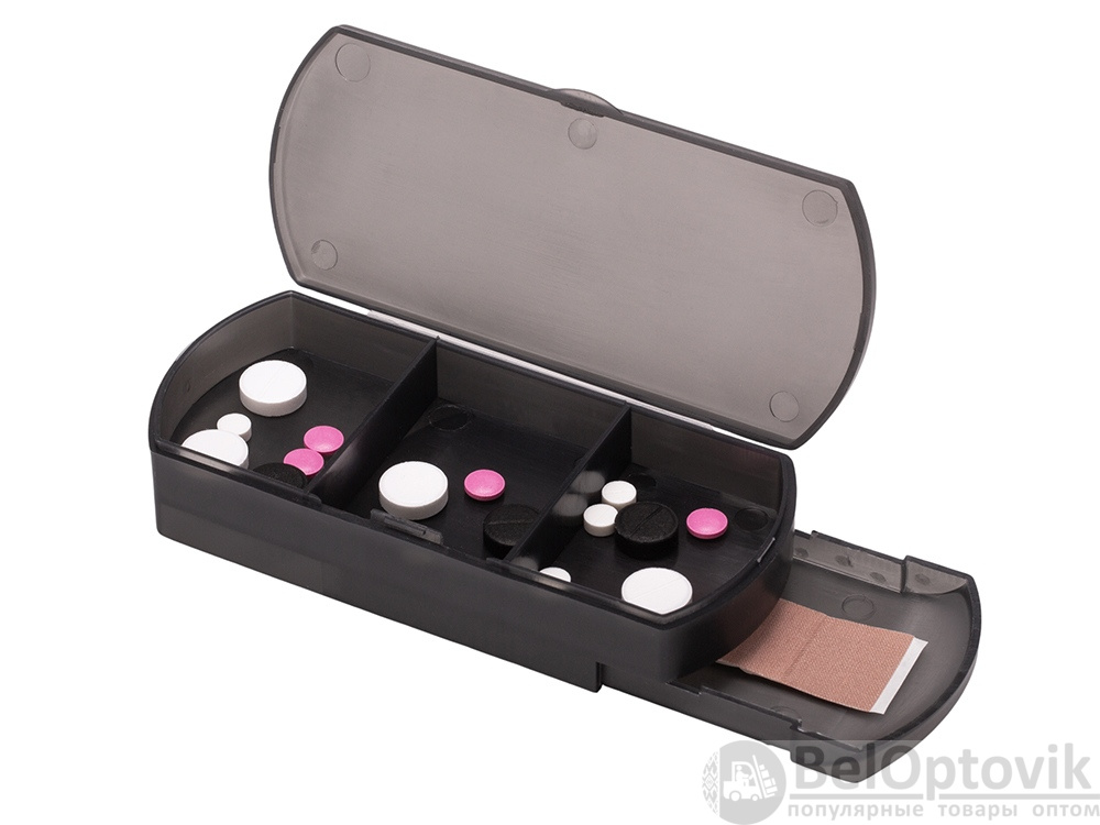 Удобная и функциональная таблетница достаточно крупного размера для больших БАДов или путешествий с дополнительным отделением для пластырей.