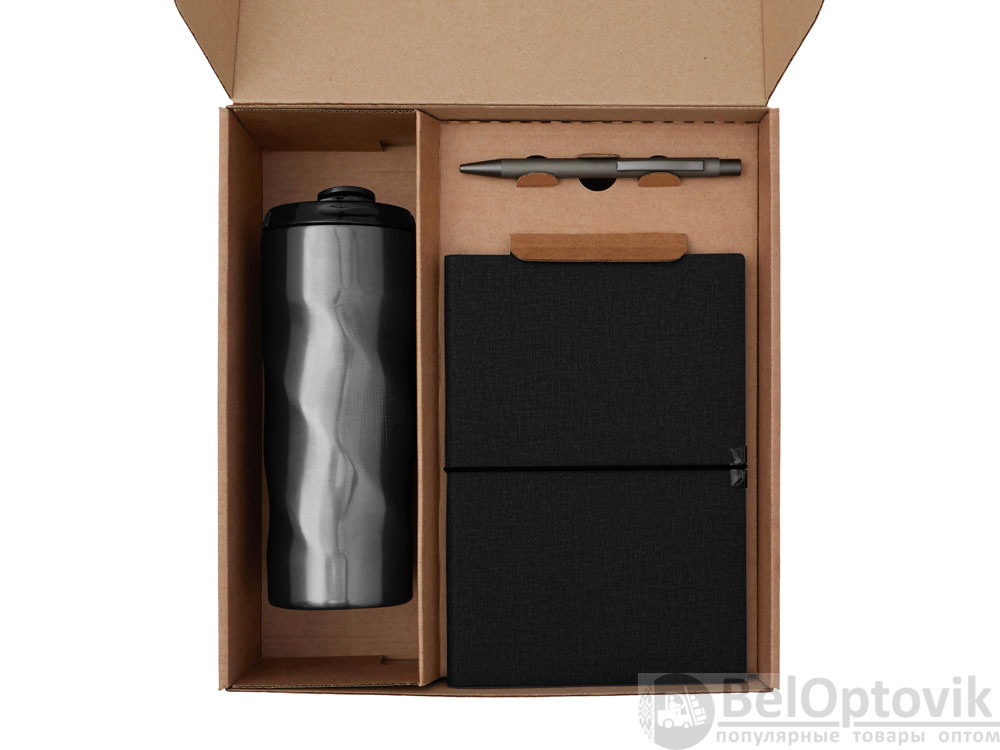 - Материал товара: блокнот- искусственная кожа, бумага, ручка - металл с поверхностью soft-touch, термокружка - кружка- нержавеющая сталь, крышка- пластик, картхолдер - переработанный полиуретан, открытка - бумага, коробка- картон