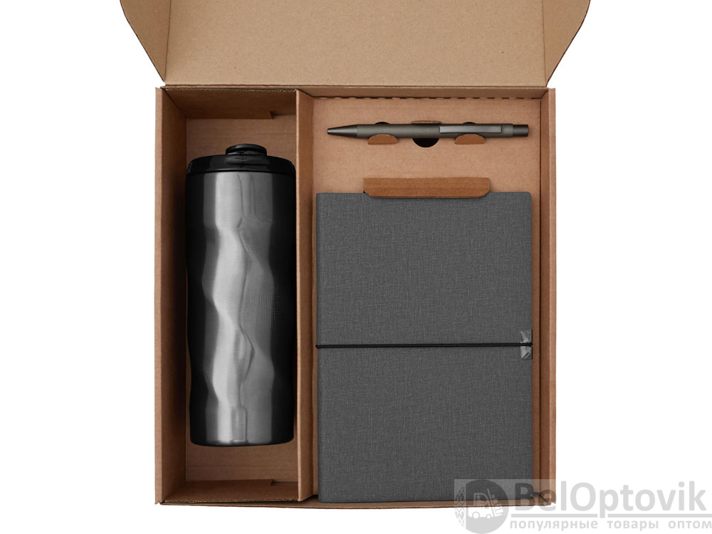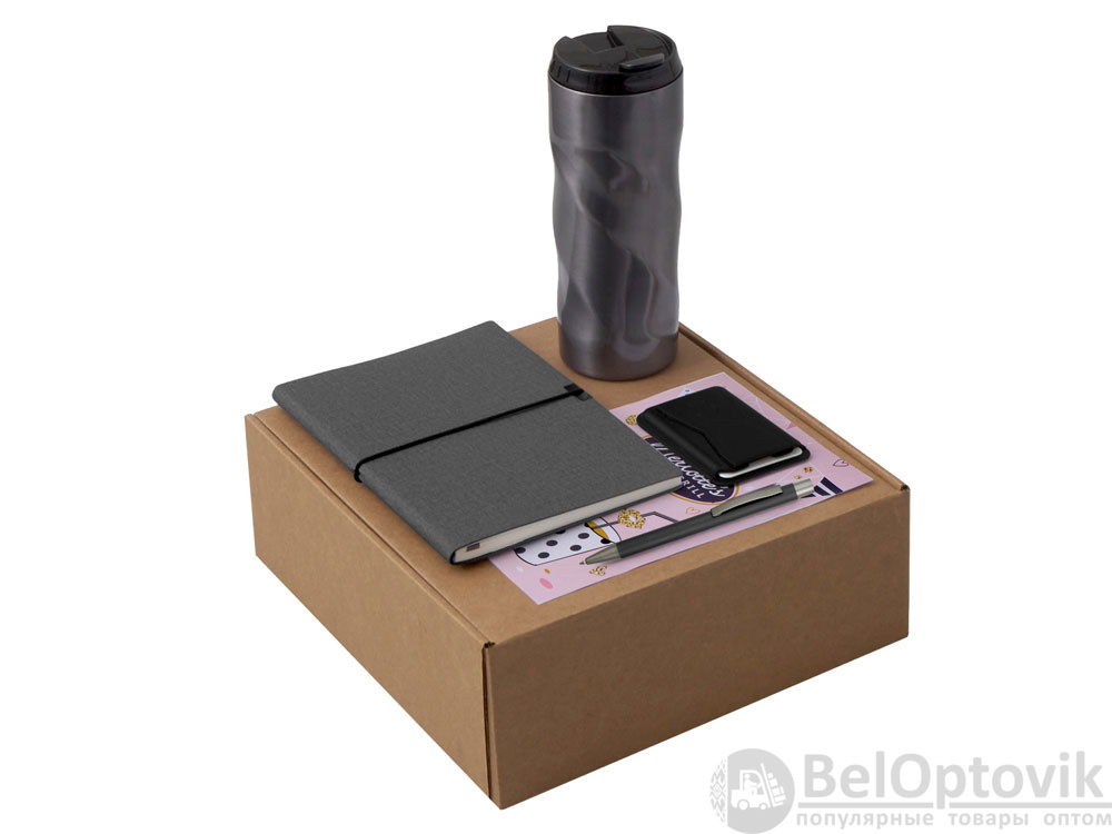 - Материал товара: блокнот- искусственная кожа, бумага, ручка - металл с поверхностью soft-touch, термокружка - кружка- нержавеющая сталь, крышка- пластик, картхолдер - переработанный полиуретан, открытка - бумага, коробка- картон