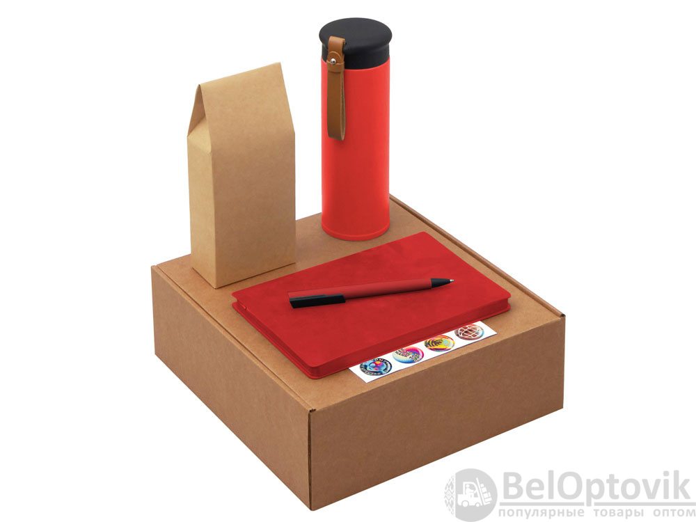 Набор «Draftea» с блокнотом, ручкой, термосом и чаем, Цвет коричневый, красный