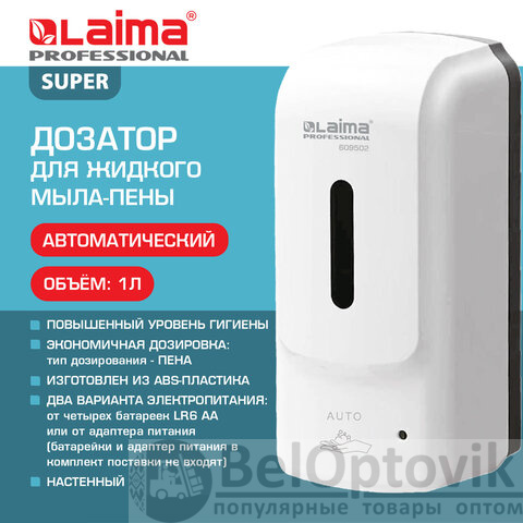 Дозатор для жидкого мыла-пены LAIMA PROFESSIONAL SUPER, НАЛИВНОЙ, СЕНСОРНЫЙ, 1 л, белый, ABS-пластик, 609502