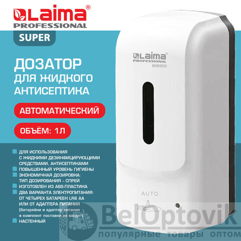 Дозатор для жидкого антисептика LAIMA PROFESSIONAL SUPER, СЕНСОРНЫЙ, 1 л, белый, ABS-пластик, 609503