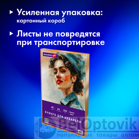 Бумага для акварели А4 в коробке, 40 листов, 200 г/м2, среднее зерно, BRAUBERG ART CLASSIC, 116355
