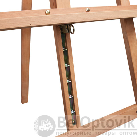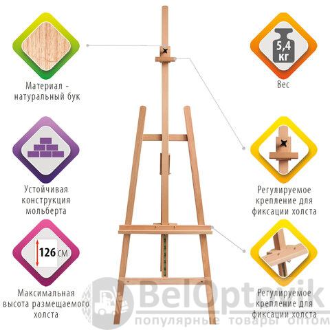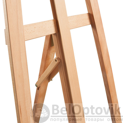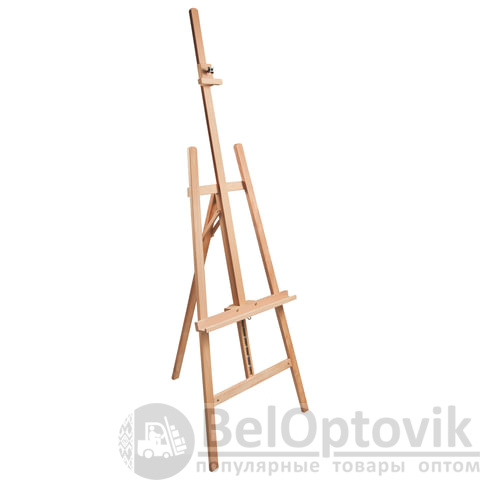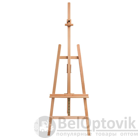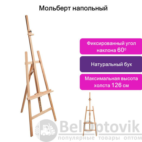 Изготовлен из натурального бука, пропитанного маслом. Мольберт напольный прост в установке, его конструкция достаточно устойчивая. Верхнее крепление позволяет прочно фиксировать холст высотой до 126 см. Мачта неподвижная с фиксированным углом наклона - 60°.
