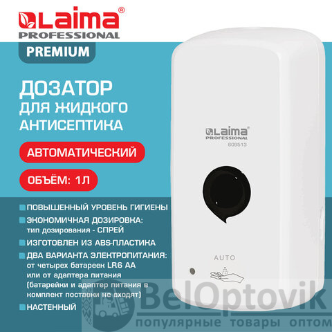 Дозатор для жидкого антисептика LAIMA PROFESSIONAL PREMIUM, СЕНСОРНЫЙ, 1 л, спрей, белый, ABS-пластик, 609513