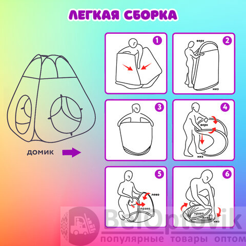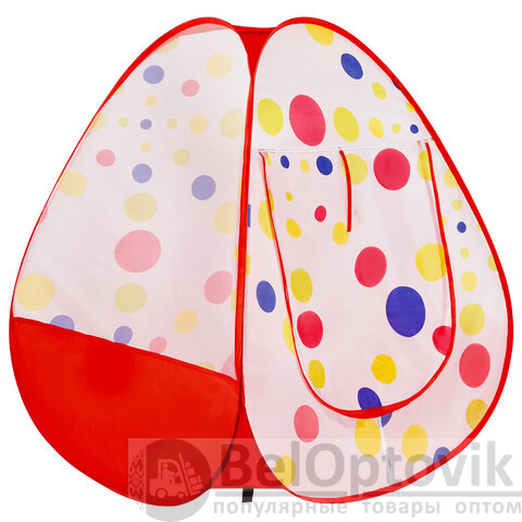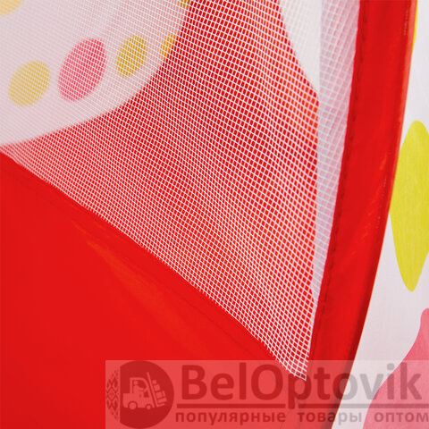 Яркий и красочный дизайн не останется без внимания. Дверь палатки поднимается, сворачиваясь в рулон наверх, и фиксируется завязкой. На двух сторонах домика расположены сетчатые окна для проветривания. На текстильном прочном дне внутри палатки удобно сидеть. Палатка изготовлена из текстильных синтетических материалов с пластиковыми элементами и легко моется простой губкой в случае загрязнения. Быстросборный пластиковый механизм домика особенно удобен для путешествий на природу, в парк, на дачу или в гости, чтобы весело провесит время одному или с друзьями.