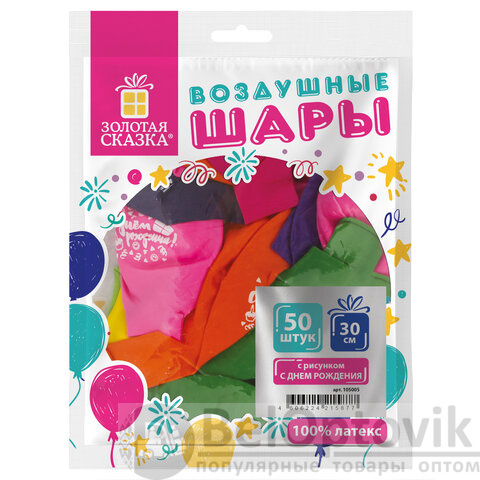 Шары воздушные ЗОЛОТАЯ СКАЗКА, 12" (30 см), КОМПЛЕКТ 50 штук, ассорти 10 цветов, с рисунком "C днем рождения", пакет, 105005