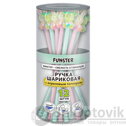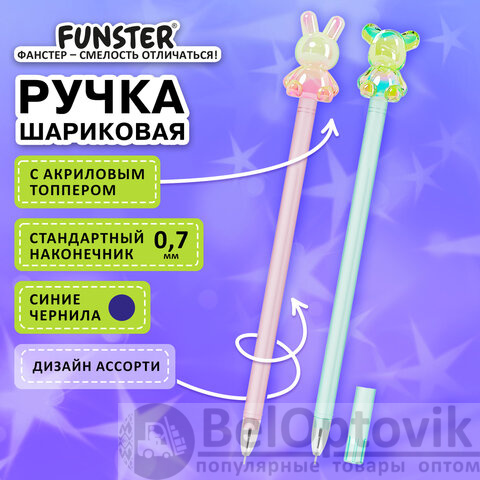 Ручка с акриловым топпером шариковая FUNSTER "BEAR&BUNNY", СИНЯЯ, ассорти, пишущий узел 0,7 мм, линия письма 0,35 мм, 144372