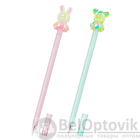 Ручка представлена в двух оригинальных дизайнах ассорти, привлекающих особое внимание. Розовый корпус дополнен акриловым топпером в форме зайчонка. Корпус голубого цвета украшает фигурка в форме медвежонка. Акриловые топперы переливаются мягким блеском, что придает им особый шарм.