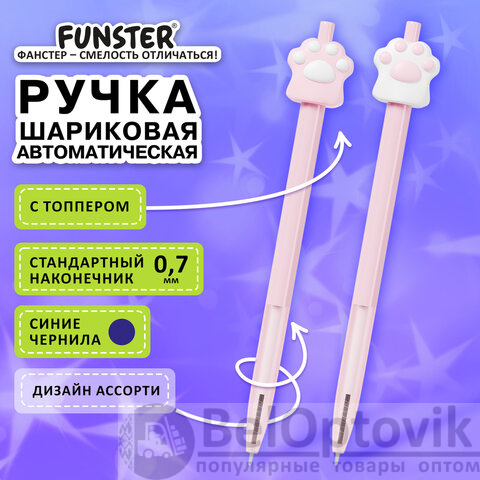 Ручка с топпером шариковая автоматическая FUNSTER "CAT PAW", СИНЯЯ, ассорти, пишущий узел 0,7 мм, линия письма 0,35 мм, 144376