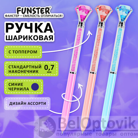 Ручка поворотная с топпером шариковая FUNSTER "SHINE BRIGHT", СИНЯЯ, ассорти, пишущий узел 0,7 мм, линия письма 0,35 мм, 144377