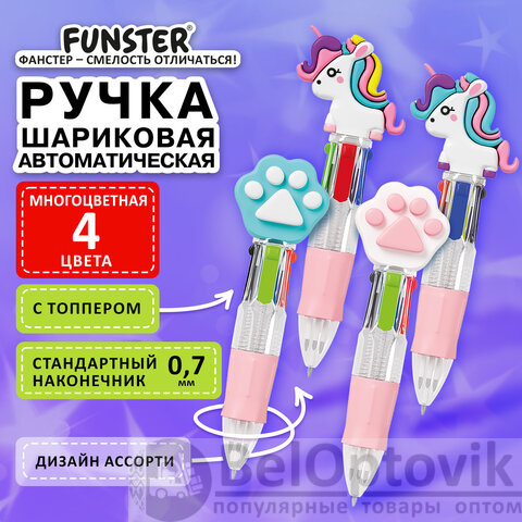 Ручка мини многоцветная с топпером шариковая автоматическая 4 ЦВЕТА FUNSTER "MIX", ассорти, пишущий узел 0,7 мм, линия письма 0,35, 144378