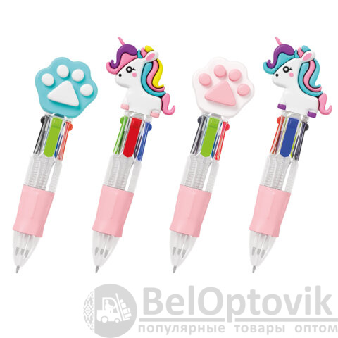Ручка имеет прозрачный корпус и дополнена очаровательными топперами ассорти: обаятельные единороги и милые лапки голубого и белого цвета.