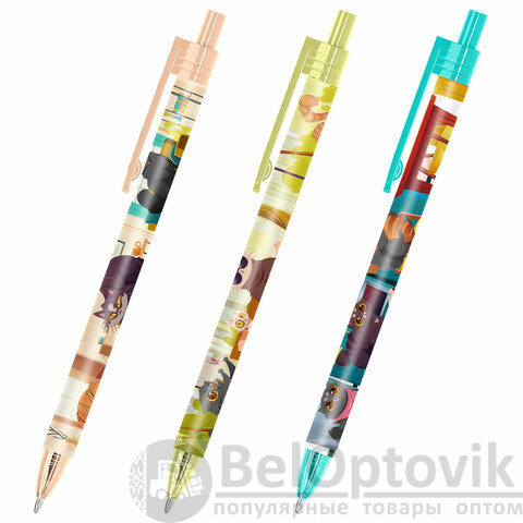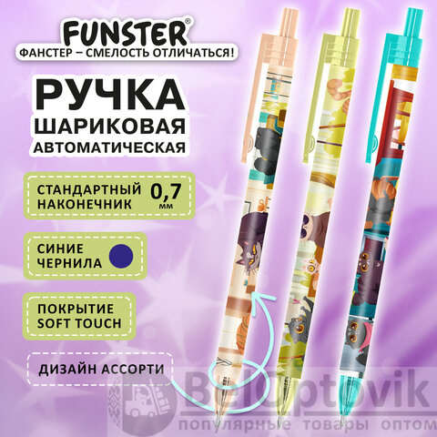 Ручка шариковая автоматическая с принтом FUNSTER "CUTE ANIMALS", корпус soft-touch, СИНЯЯ, пишущий узел 0,7 мм, линия письма 0,35 мм, 144402
