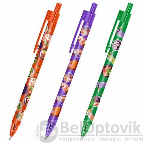Ручка шариковая автоматическая с принтом FUNSTER "TASTY FOOD", корпус soft-touch, СИНЯЯ, пишущий узел 0,7 мм, линия письма 0,35 мм, 144403