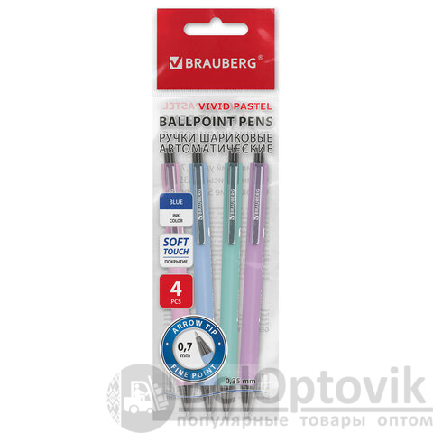 Ручки шариковые автоматические BRAUBERG "VIVID PASTEL", СИНИЕ, НАБОР 4 ШТУКИ, soft-touch, пишущий узел 0,7 мм, линия письма 0,35 мм, 144408