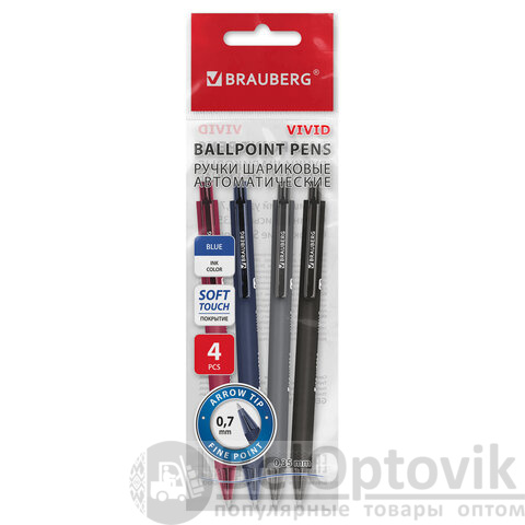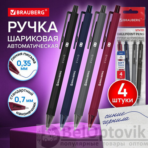 Ручки шариковые автоматические BRAUBERG "VIVID", СИНИЕ, НАБОР 4 ШТУКИ, soft-touch, пишущий узел 0,7 мм, линия письма 0,35 мм, 144409