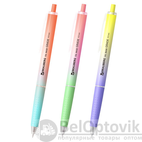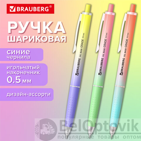 Автоматическая шариковая ручка BRAUBERG "OIL-BASE GRADE", элегантная модель доступна в трёх нежных пастельных градиентах: голубой-розовый, зелёный-персиковый и фиолетовый-желтый – идеальное сочетание для тех, кто ценит изящность и индивидуальность. Мягкий soft-touch корпус и прорезиненная рукоять обеспечивают комфортное и надежное держание даже во время длительного письма. Благодаря инновационной масляной технологии чернил, вы получите исключительно плавное и мягкое письмо без усилий. Тонкий игольчатый наконечник диаметром 0,5 мм оставляет изящную линию шириной всего 0,3 мм, позволяя создавать точные и аккуратные записи.