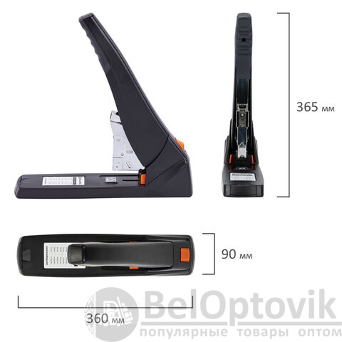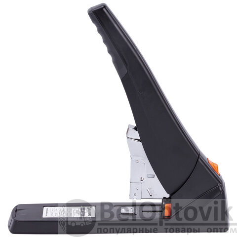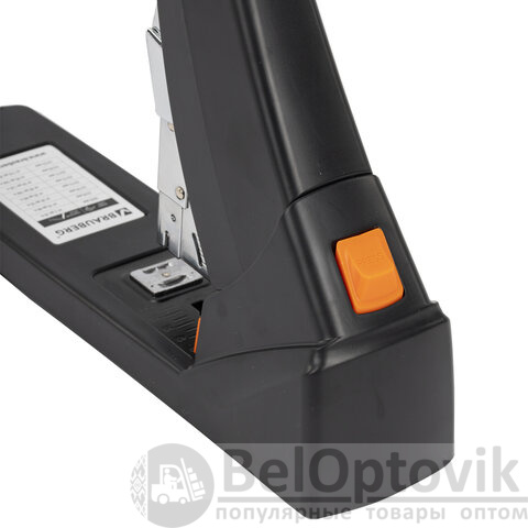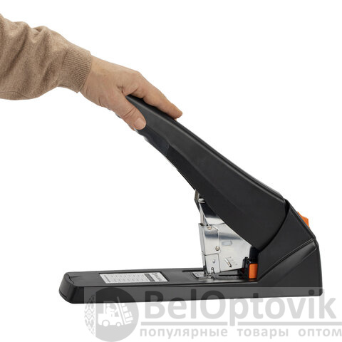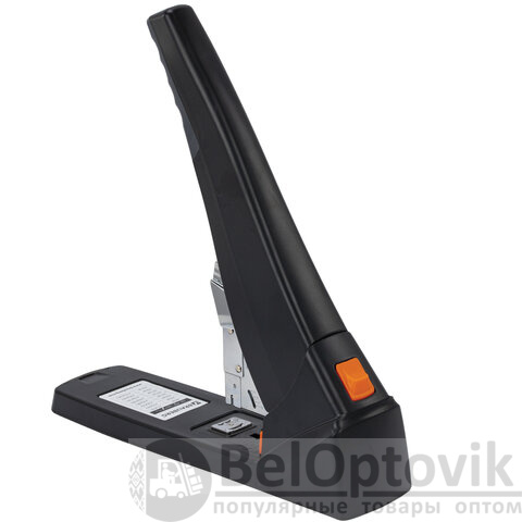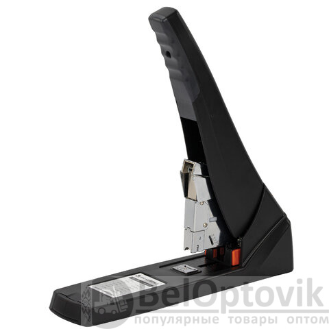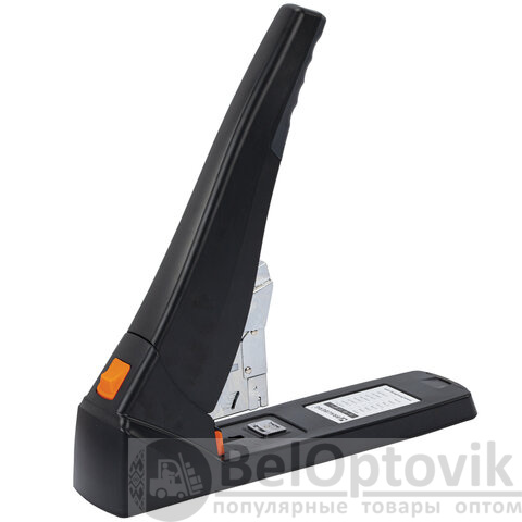 Рабочий механизм выполнен из металла, корпус – из пластика черного цвета. Способен скрепить до 200 листов бумаги. Подходит для скоб № 24/6 - № 23/23. Глубина закладки бумаги регулируется – до 50 мм. Закрытый вид сшивания.
