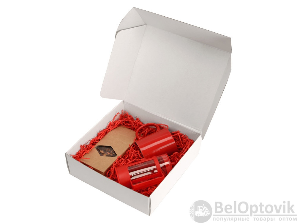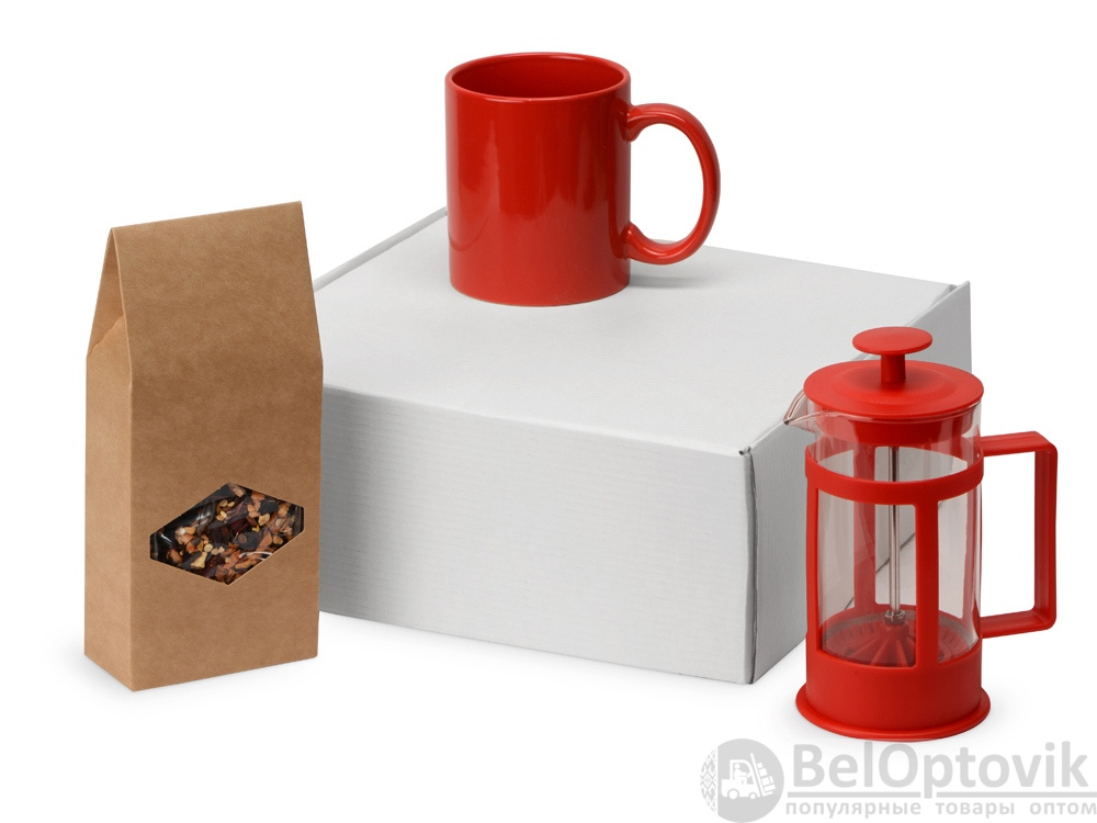 Подарочный набор с чаем, кружкой и френч-прессом «Чаепитие», Цвет кружка- красный, френч-пресс- красный/прозрачный