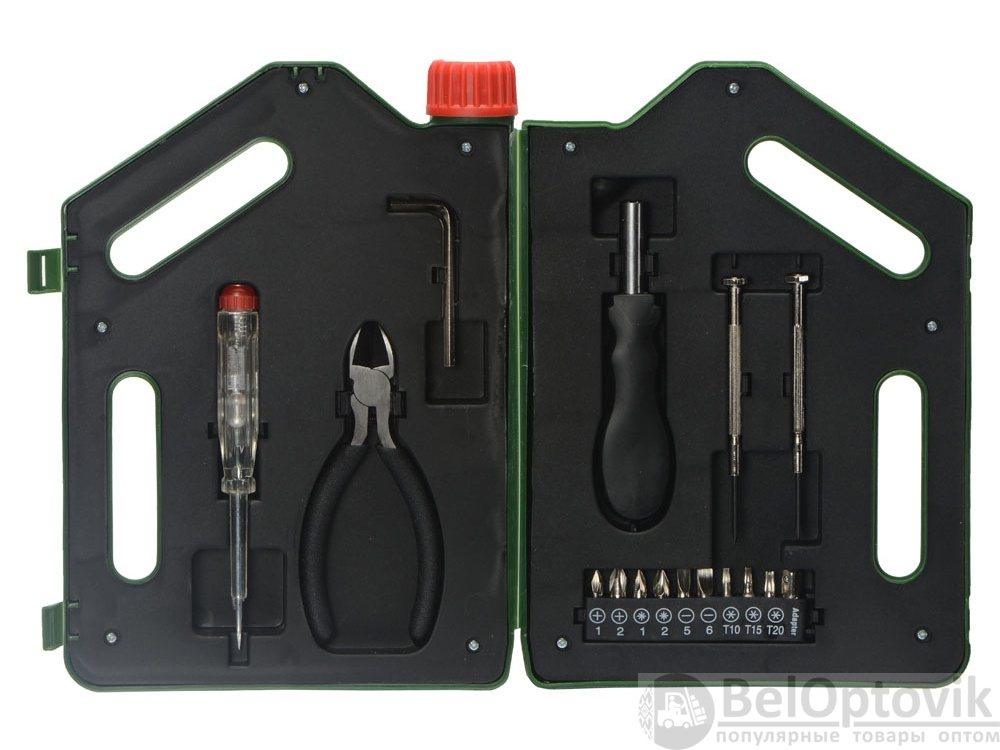 Набор инструментов в футляре в виде канистры включает в себя 1 тестер напряжения, 1 пару плоскогубцев, 1 шестигранный ключ, 1 рукоятку, к которой можно крепить отвертки, 2 прецизионные отвертки, 1 крестообразную головку, 1 плоскую головку, 10 бит.