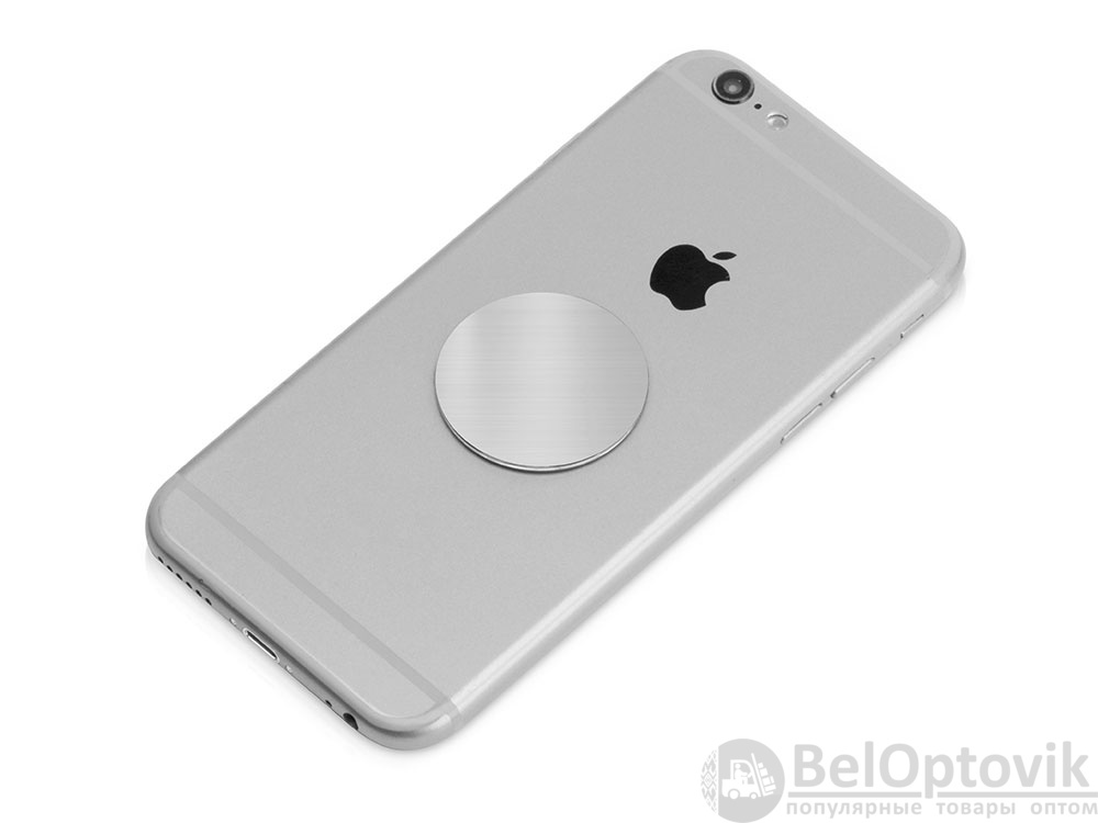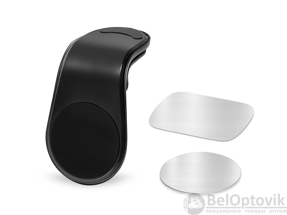 Магнитный держатель для телефона крепится к вентиляционной решетке автомобиля при помощи прищепки, которая снабжена прорезиненными вставками для плотного сцепления с поверхностью. Также в комплекте идут 2 самоклеящиеся стальные пластины. Они крепятся к смартфону.