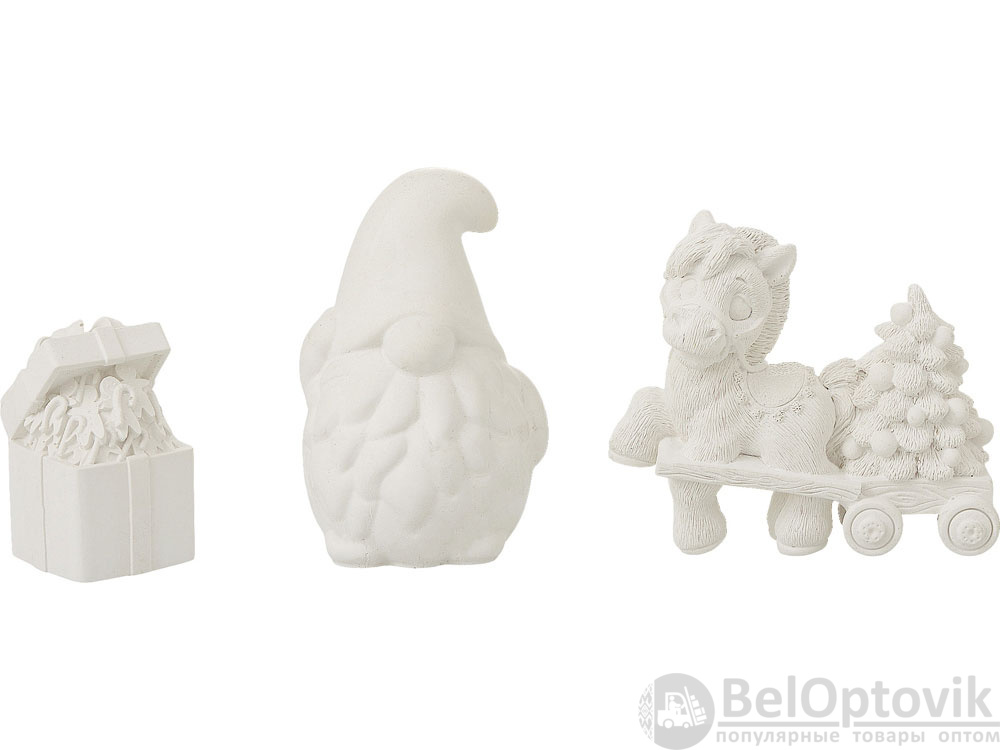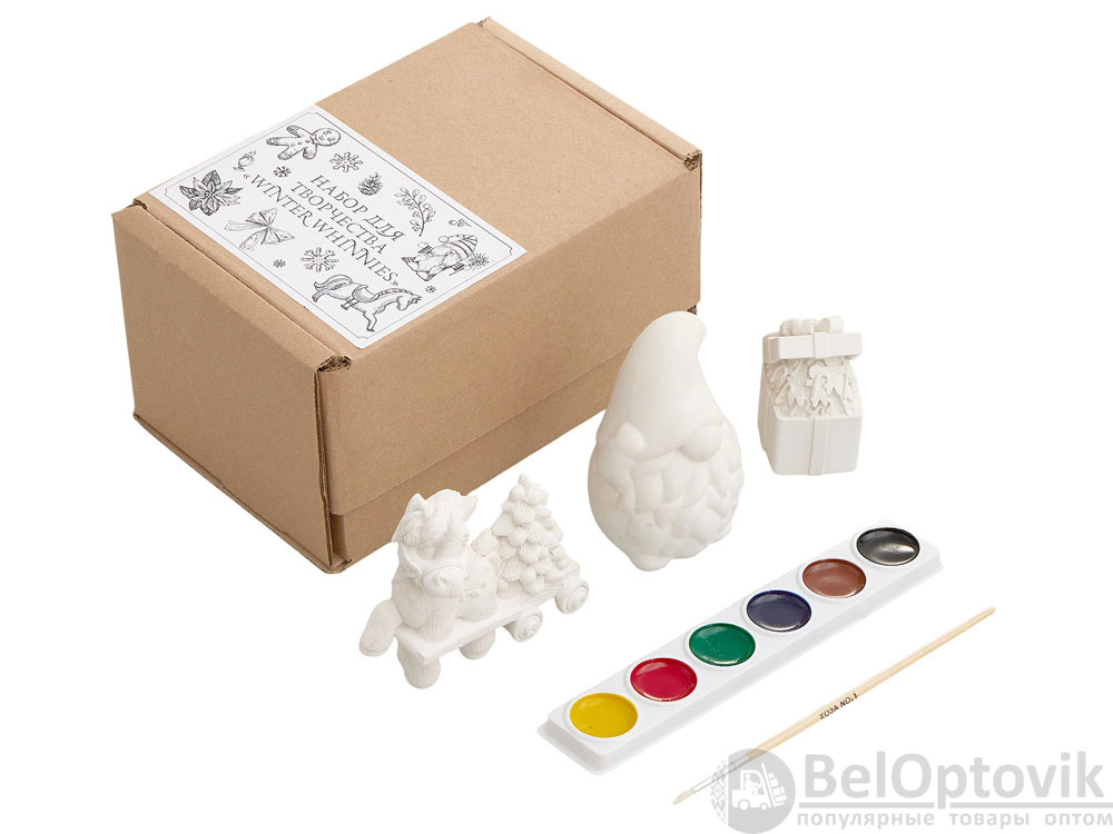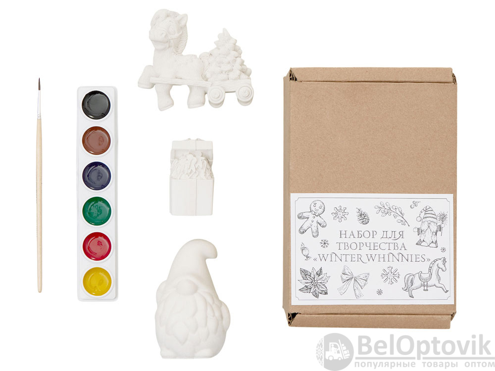 В набор входят три гипсовых фигурки — лошадка елочкой, гном подарочная коробка с пряничными человечками, а также акварельные краски и кисть.