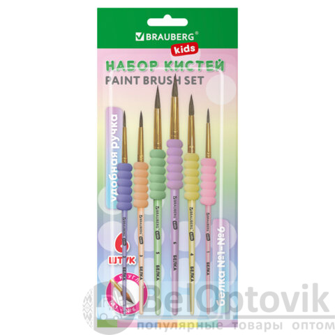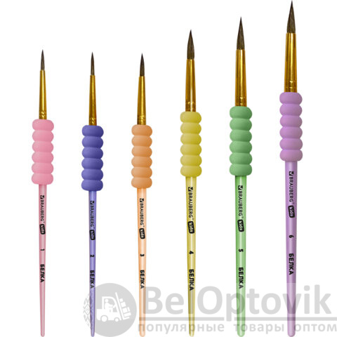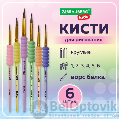 Кисти c EVA-вставкой БЕЛКА набор 6 шт. (круглые №1, 2, 3, 4, 5, 6), блистер, BRAUBERG KIDS, 201093