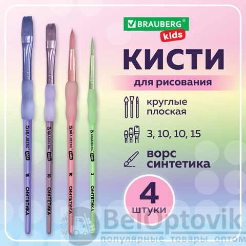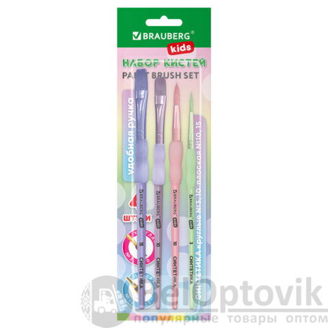 Набор из четырёх кистей разного размера c мягкой силиконовой вставкой BRAUBERG KIDS позволяет начинающим художникам решать любые творческие задачи в детском саду, школе и дома.