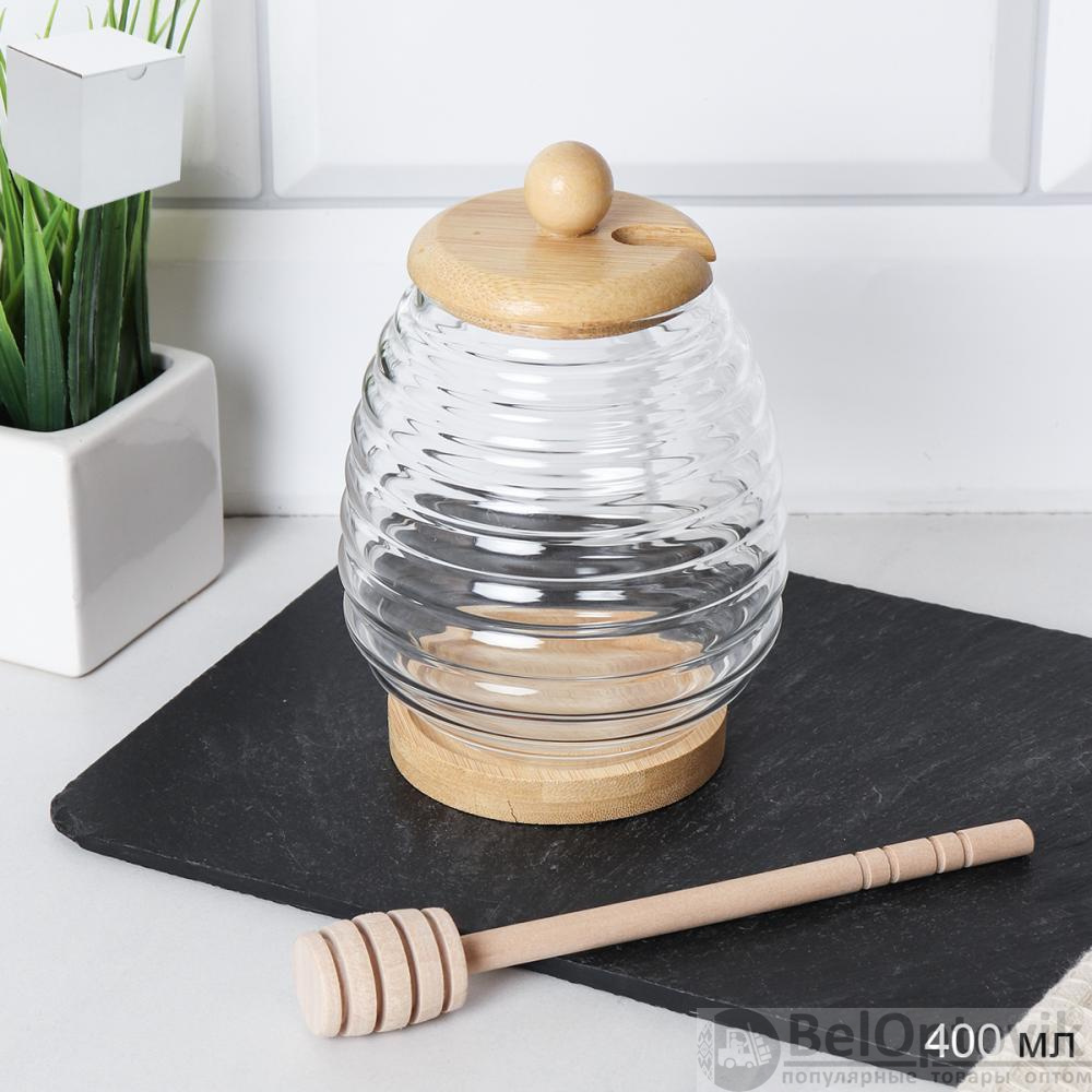 Банка для меда с ложкой на подставке бамбуковая крышка 400 мл / 7458 /уп 120/