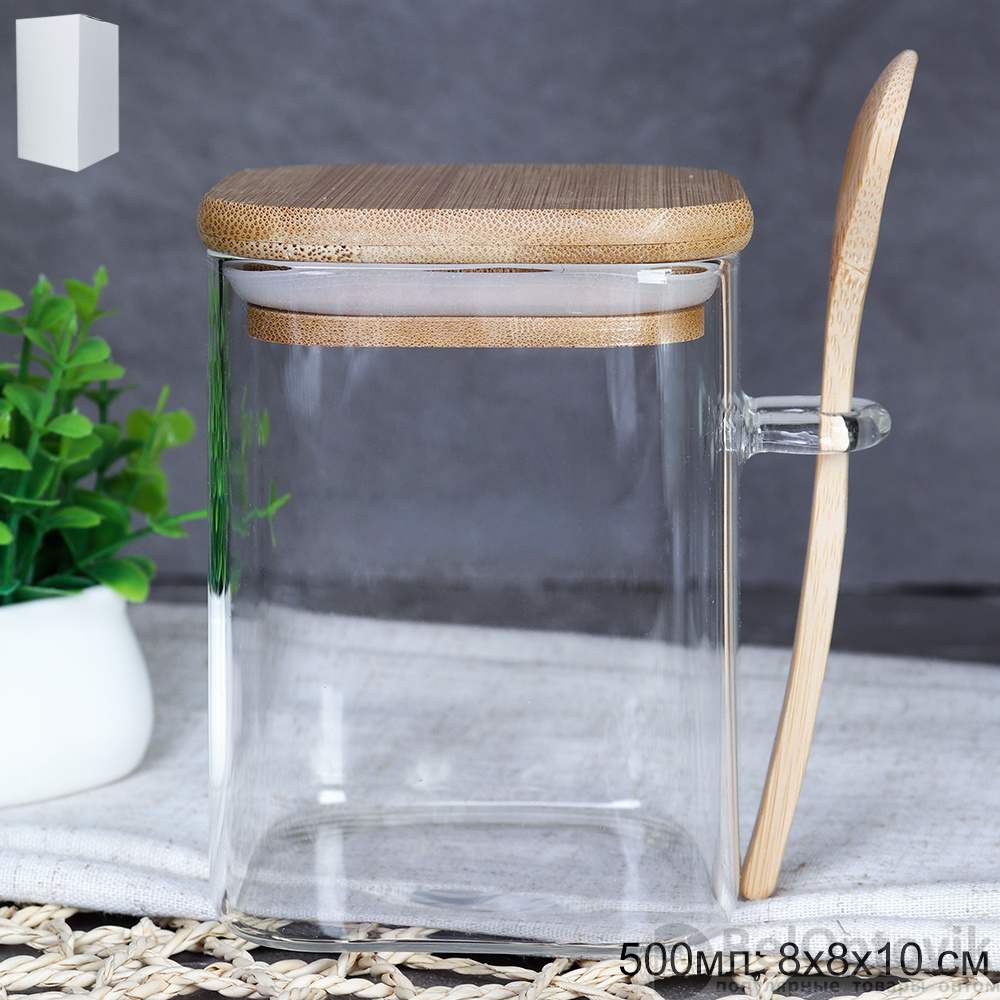 Банка квадратная с ложкой бамбуковая крышка 500 мл 8x8x10 см / LCKW2914 /уп 100/*