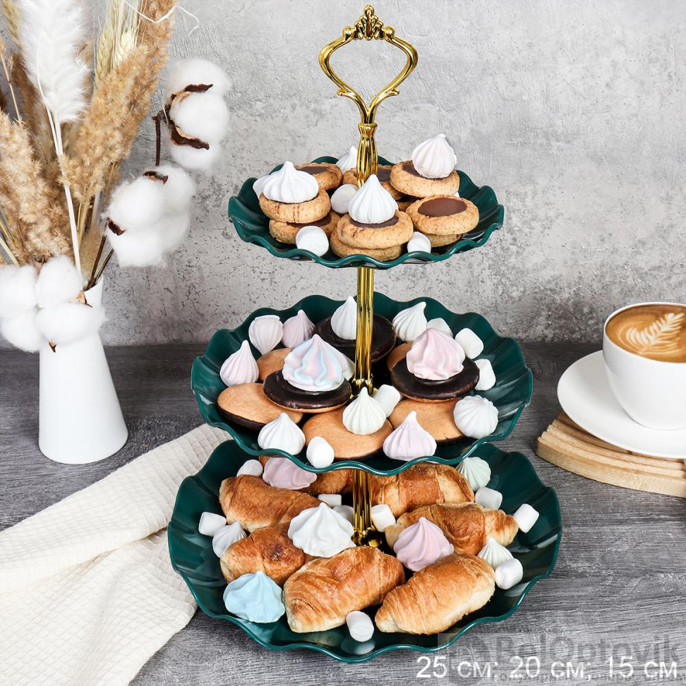 Ваза для капкейков 3-х ярусная 15/20/25 Круг Волна зеленая / D-1267 /уп 80/ Пластик/689068