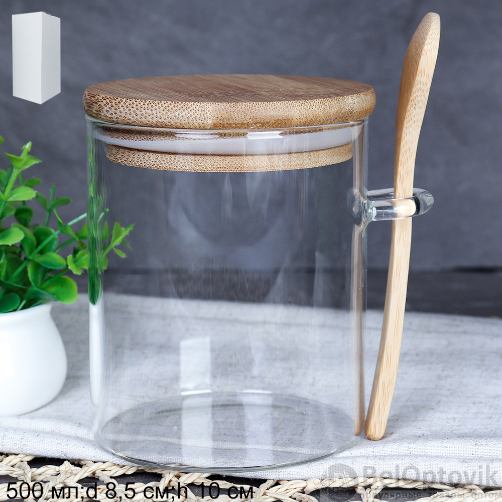 Банка круглая с ложкой бамбуковая крышка 500 мл 8,5х10 см / LCKW2904 /уп 120/*