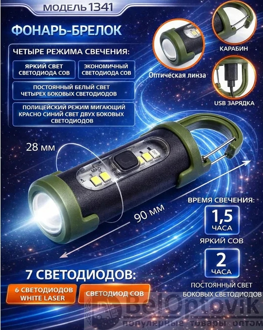 Четыре режима свечения: яркий свет светодиода СОВ, экономичный свет светодиода СОВ, постоянный белый свет четырех боковых светодиодов, полицейский режим мигающий красно-синий свет двух боковых светодиодов.