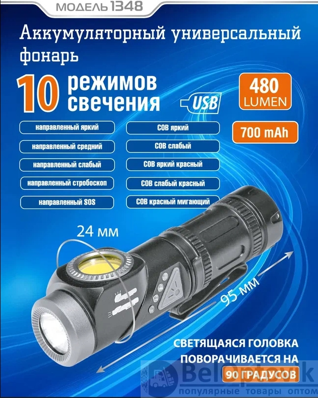 Десять режимов свечения, из них пять режимов направленного светодиода: яркий направленный свет, средний направленный свет, экономичный направленный