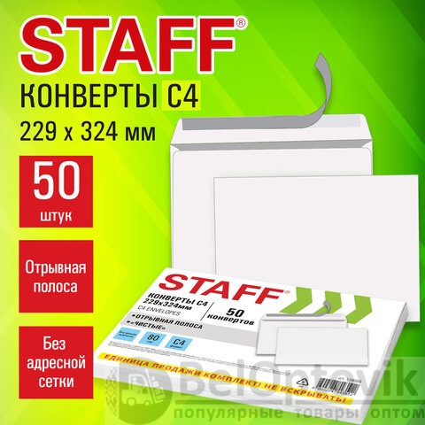 Конверты С4 (229х324 мм), отрывная лента, 80 г/м2, КОМПЛЕКТ 50 шт., внутренняя запечатка, STAFF, 118668