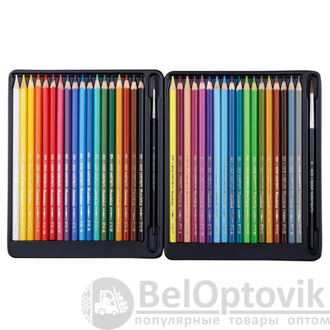 В набор входят: 36 карандашей, кисть из высококачественной синтетики, точилка.