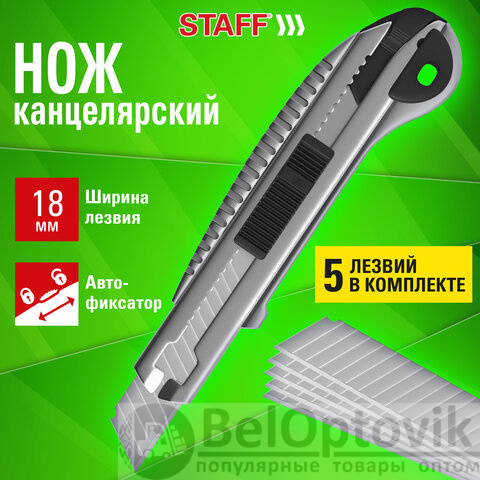 Нож канцелярский 18 мм, 5 лезвий в комплекте, автофиксатор, металлический цвет, STAFF, 273930