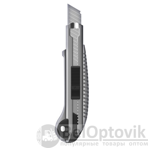 Благодаря своей обтекаемой форме нож удобно держать в руке. Пластиковый корпус гарантирует безопасность применения. Автофиксатор позволяет закрепить лезвие в нужном положении с помощью защелки. Для того, чтобы хранить и переносить инструмент было проще, в корпусе имеется небольшое отверстие. Нож усилен металлическими направляющими, которые надежно удерживают лезвие шириной 18 мм и позволяют выдерживать большую нагрузку.