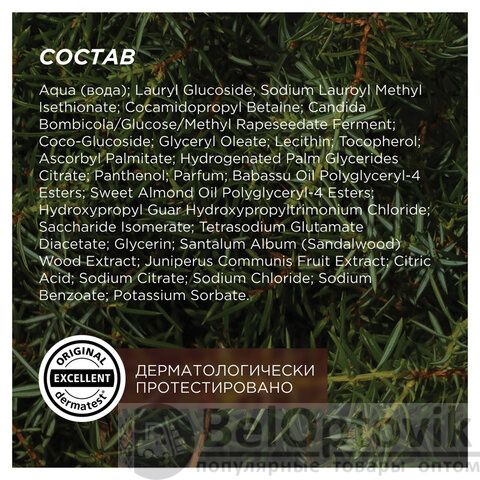 Состав: Aqua, Lauryl Glucoside, Sodium Lauroyl Methyl Isethionate, Cocamidopropyl Betaine, Candida Bombicola/Glucose/Methyl Rapeseedate Ferment, Coco-Glucoside, Glyceryl Oleate, Lecithin, Tocopherol, Ascorbyl Palmitate, Hydrogenated Palm Glycerides Citrate, Panthenol, Parfum, Babassu Oil Polyglyceryl-4 Esters, Sweet Almond Oil Polyglyceryl-4 Esters, Hydroxypropyl Guar Hydroxypropyltrimonium Chloride, Saccharide Isomerate, Tetrasodium Glutamate Diacetate, Glycerin, Santalum Album Wood Extract, Juniperus Communis Fruit Extract, Citric Acid, Sodium Citrate, Sodium Chloride, Sodium Benzoate, Potassium Sorbate.