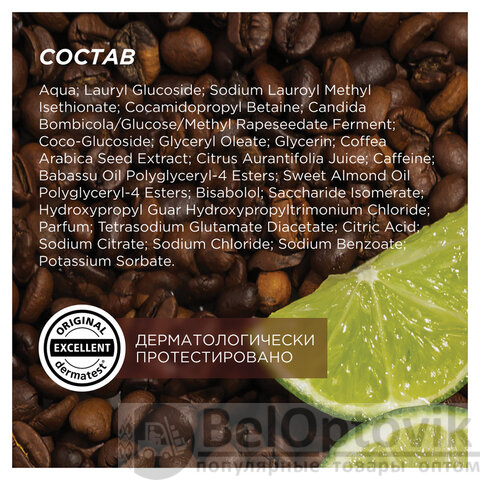 Состав: Aqua, Lauryl Glucoside, Sodium Lauroyl Methyl Isethionate, Cocamidopropyl Betaine, Candida Bombicola/Glucose/Methyl Rapeseedate Ferment, Coco-Glucoside, Glyceryl Oleate, Glycerin, Coffea Arabica Seed Extract, Citrus Aurantifolia Juice, Caffeine, Babassu Oil Polyglyceryl-4 Esters, Sweet Almond Oil Polyglyceryl-4 Esters, Bisabolol, Saccharide Isomerate, Hydroxypropyl Guar Hydroxypropyltrimonium Chloride, Parfum, Tetrasodium Glutamate Diacetate, Citric Acid, Sodium Citrate, Sodium Chloride, Sodium Benzoate, Potassium Sorbate.