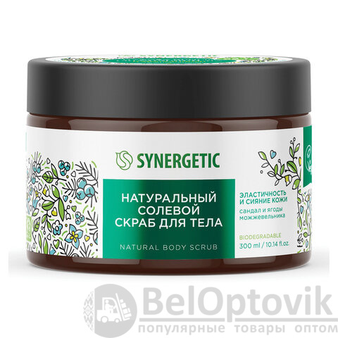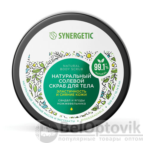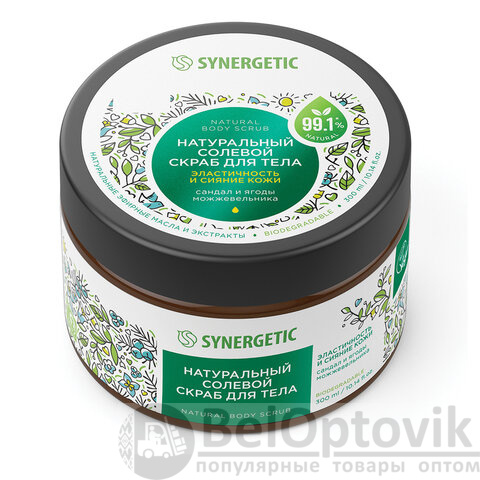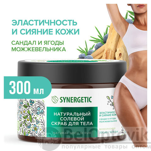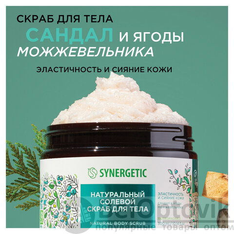 Натуральный солевой скраб для тела SYNERGETIC эластичность и сияние кожи "Сандал и ягоды можжевельника" – это эффективное средство для ухода за кожей, состоящее из натуральных компонентов.