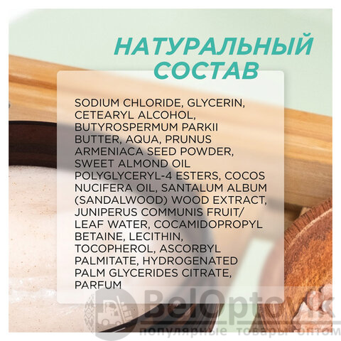 Состав: Sodium Chloride, Glycerin, Cetearyl Alcohol, Butyrospermum Parkii Butter, Aqua, Prunus Armeniaca Seed Powder, Sweet Almond Oil Polyglyceryl-4 Esters, Cocos Nucifera Oil, Santalum Album (Sandalwood) Wood Extract, Juniperus Communis Fruit/Leaf Water, Cocamidopropyl Betaine, Glyceryl Oleate, Lecithin, Tocopherol, Ascorbyl Palmitate, Hydrogenated Palm Glycerides Citrate, Parfum, Sodium Benzoate, Potassium Sorbate, Citric Acid.